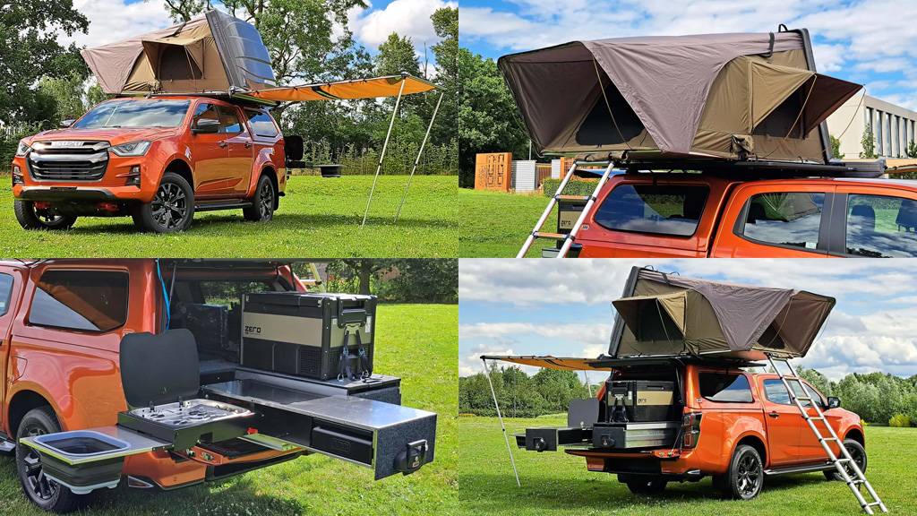 تتضمن حزمة التخييم هذه خيمة ومظلة ممتدة بلون مشابه للون الخارجي للشاحنة الصغيرة، بالإضافة إلى عدة عناصر تصميم تدعم رحلات التخييم في البيئة الخارجية.