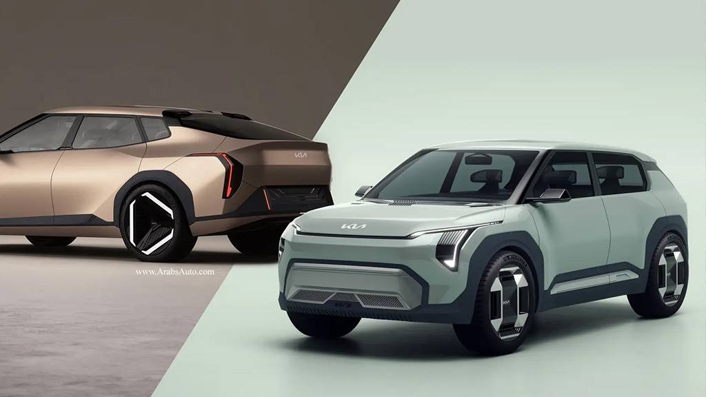 مصابيح سيارة كيا EV3 تظهر تشابهًا مع مصابيح سيارة كيا EV9، وكذلك تصميم العجلات والأطراف الأمامية السميكة، لكن بحجم أصغر.